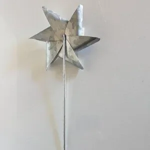 A pretty galvanized metal non-moving pinwheel potted plant pick by Michael's Ashland brand. This fixed pin wheel on a metal pick is perfect for adorning your plants or flowerbed. This durable plant pot, yard or outdoor patio decor item measures: approx 4.5" tall pinwheel on an 9.5" tall pick (total length of item), does not spin (is fixed in place) and is brand new without tags. It makes a perfect accessory for your beach house, porch or garden :)