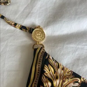 Elegant bikini with intricate gold patterns. Triangle top with adjustable straps. Matching bottoms with a comfortable fit.