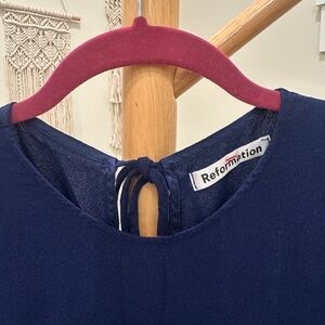 Elegant Reformation navy blue maxi dress featuring a soft, lightweight drape with semi-sheer detailing at the bodice. Designed with cap sleeves, a rounded neckline with back tie, and a flowing long silhouette. Made in the USA of imported fabric using a breathable viscose-rayon blend. A timeless, minimalist piece suitable for events, weddings, or elevated everyday wear.