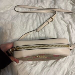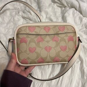 Elegant Coach crossbody with pink heart accents. Ideal for everyday style.