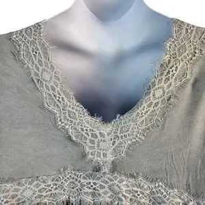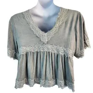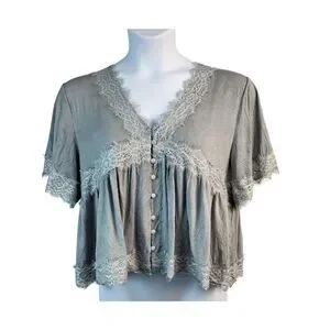 NEW POL Large Gray Cropped Blouse Short Sleeves Deep V-Neck Feathered Lace BOHO