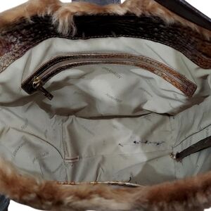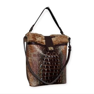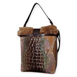 Brahmin Shira Genuine Shearling Croc Embossed Leather Bucket Shoulder Bag EUC