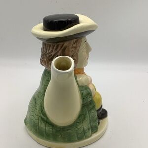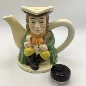 Charming ceramic teapot with a vintage Toby character figurine sitting with pen and paper design. Features a mix of cream, green, yellow, and black colors. Note chip on inside of lid - see last photo. Priced accordingly. Unmarked.
