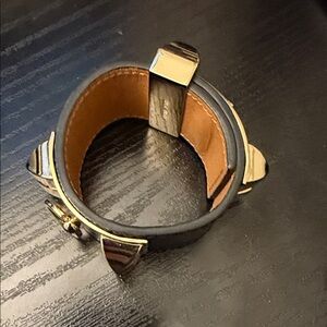 Stylish belt with gold accents and black leather. Perfect for adding a touch of luxury to any outfit.