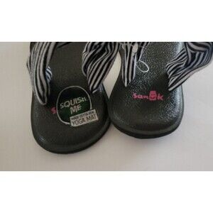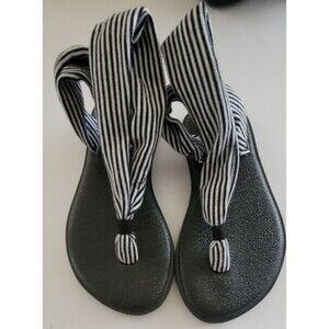 The Sanuk Yoga Mat Sling Back Sandals in girls' size 11-12 are a stylish and comfortable option for young girls. These black and white striped sandals feature a slip-on closure, open toe design, and flat heel, making them perfect for travel, activewear, and casual occasions during the summer and spring seasons.