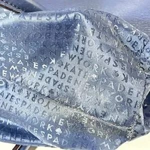 Introducing a Kate Spade New York Atwood Place Larson Satchel in Nisha Atwood style, featuring a tassel detail, crafted in blue leather, with minor wear and stains on the inside as shown. This item is in good used condition.