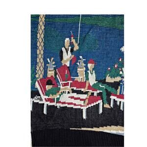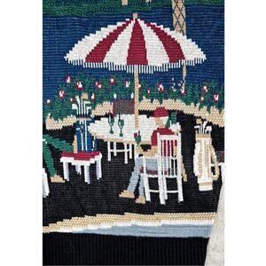 Step into timeless leisure style with this Jack Nicklaus cotton sweater, featuring a vibrant woven resort illustration. The scene captures a sun-soaked country club moment: palm trees sway over beach umbrellas, lounge chairs, and relaxed golfers enjoying drinks and conversation. Rich blues, greens, and warm tones evoke a serene lakeside escape — perfect for collectors or anyone drawn to vintage golf aesthetics.