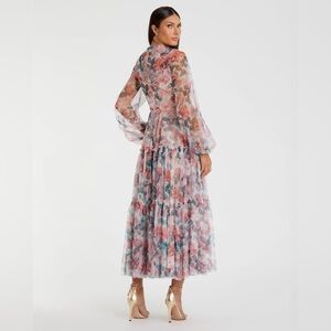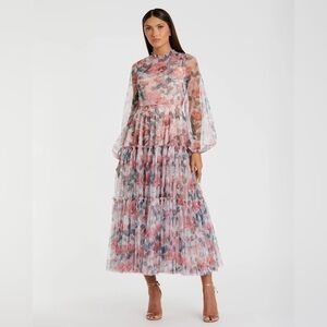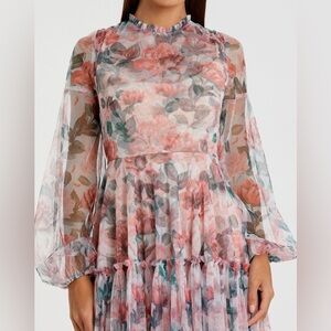 This dress boasts a high neckline and long balloon sleeves, adding sophistication to your look. With its delicate floral print on chiffon fabric, it brings a touch of romance to any occasion. Perfect for special events or garden parties, this midi dress ensures you'll stand out.