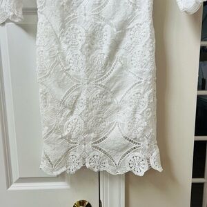 Discover elegance with this stunning white lace dress. Its intricate design and long sleeves make it perfect for any special occasion.