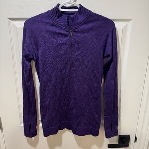 Lululemon - Rest Less 1/2 Zip, Dark Court Purple. Preloved with normal wear, but no rips or stains and plenty of life left. If I remember correctly, this top should be size 6. Material is stretchy. Approximate measurements (taken flat) - Pit-to-Pit:15", Length from Shoulder to Front Bottom Hem: 25", Sleeve length: 28"