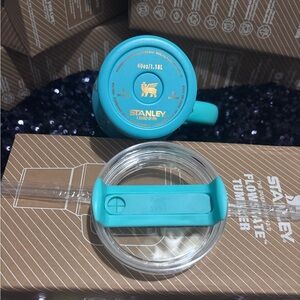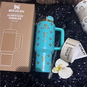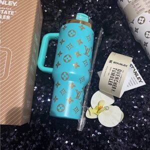 Elegant Stanley tumbler in turquoise with gold patterns. Ideal for travel and daily use.keeps your drink cold or hot for hours