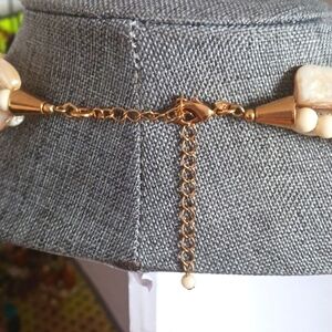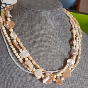 Elevate your elegance with this exquisite multistrand necklace, featuring lustrous ivory faux pearls interwoven with genuine shell beads. This pre-loved piece, ranging from 20 to 23 inches, embodies timeless beauty and sophistication. Each strand is meticulously crafted to create a harmonious blend of classic and natural elements, ensuring it graces your neck with effortless charm. Perfect for any occasion, this versatile necklace will add a touch of refined grace to your ensemble. Rediscover the allure of pearls and the beauty of nature with this stunning accessory.
