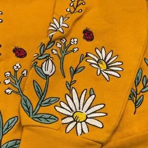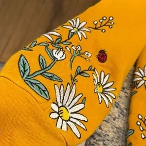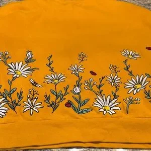 Bright yellow sweater with charming floral and character accents. Adds a playful touch. This is the most charming sweater I have ever had.