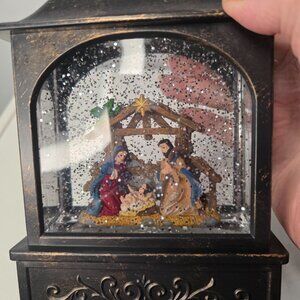 Nativity Scene Lighted Snow Globe Motion Glitter Lantern. Battery operated (batteries not included). Also corded adapter (included). About 9.5" tall x 5" long.
