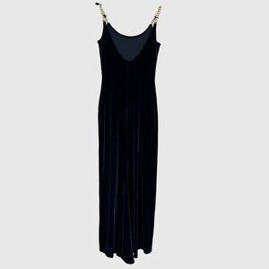 Dazzle in this stunning midnight blue velour maxi dress, a vintage-inspired silhouette that exudes timeless Hollywood glamour. The sleek, form-fitting cut with jeweled chain-link straps glides over your figure, creating a sophisticated and head-turning look perfect for any formal event. Size: Extra Small Measurements: PTP 15"; Waist- 13"; Hips - 16"; Length - 55" Colour: Midnight blue Fabric: 90% Polyester 10% Spandex Additional Notes: Non-smoker & pet free home.