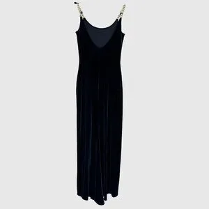Dazzle in this stunning midnight blue velour maxi dress, a vintage-inspired silhouette that exudes timeless Hollywood glamour. The sleek, form-fitting cut with jeweled chain-link straps glides over your figure, creating a sophisticated and head-turning look perfect for any formal event.