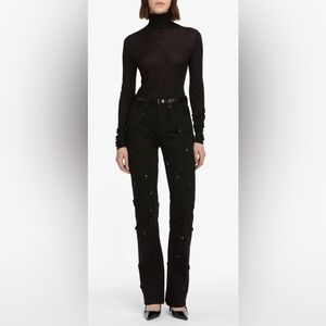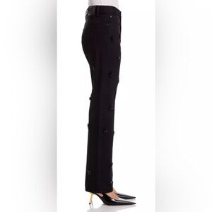 Chic black high rise jeans with elegant embellishments. Perfect for a stylish look.