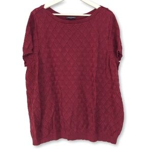 ModCloth lightweight short-sleeve sweater in mauve with a diamond knit and textured pointelle design. Pullover styling. Made in Turkey, style OBI163666.