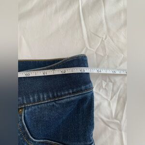 Classic dark blue denim jeans. Features contrast stitching. Comfortable and stylish. Pull on jeans are a cropped length with a raw hem. The front pockets are faux and the back pockets are functional. Size small jeans are 77% cotton, 12% lyocell and 3% Elastane.
