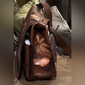 Elegant crossbody bag with artistic design. Rich brown leather. Perfect for any occasion.o