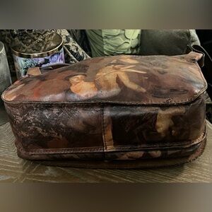 Patricia Nash leather crossbody bag featuring the "Roman Goddess" print. The design typically includes a flap with central lacing detail and a long adjustable leather strap for crossbody wear.