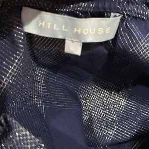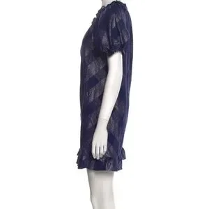 HILL HOUSE NAVY BLUE RUFFLE SHORT SLEEVE ROUND NECK SILVER METALLIC THREAD SHIFT DRESS