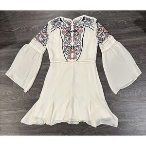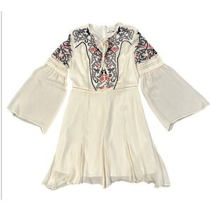 Parker Mini Dress Womens Small Medium Silk Embroidered Boho Bell Sleeve Whimsy