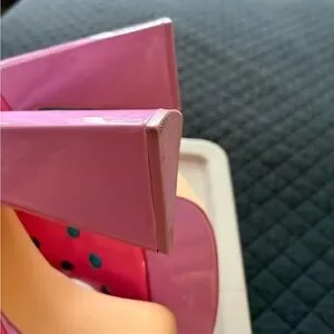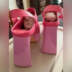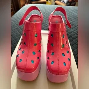Bold pink platforms with blue polka dot accents. Eye-catching and stylish.