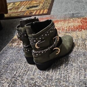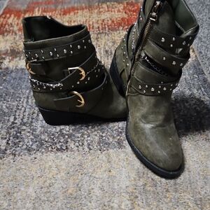 Stylish olive green boots with studded straps. Perfect for a bold look.