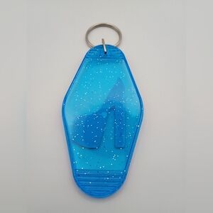 Stylish blue glitter keychain featuring a pink high heel charm. Perfect for adding flair to your keys.