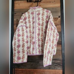 Stay cozy and stylish with this free people floral chloe quilted jacket. Featuring a beautiful cream and pink design, it's perfect for any occasion.