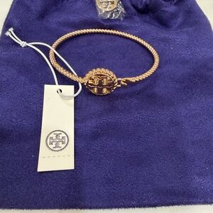 Chic gold bangle with signature Tory Burch logo. Adds elegance to any outfit.