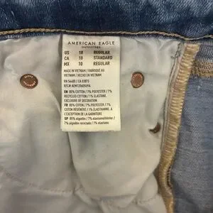 The American Eagle Super Hi-Rise Flare Ripped Jeans in Women's size 10, Blue color are a stylish and trendy addition to any wardrobe. Made with a blend of polyester, spandex, and cotton, these denim jeans offer a comfortable and flattering fit. The high rise and flared leg give a fashion-forward look, while the distressed detailing adds a touch of edgy style. Complete with zip and button closure, these versatile jeans are perfect for everyday wear or dressing up for a night out.