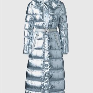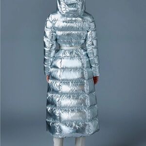 Shine in this metallic silver puffer by Mackage. Long design for ultimate warmth. Stylish and functional.