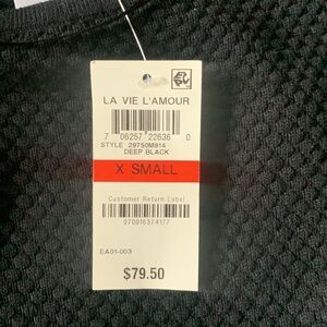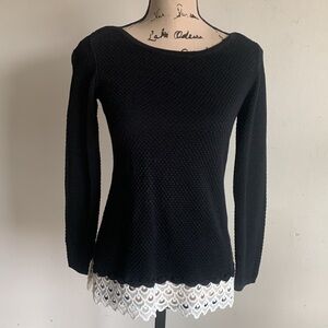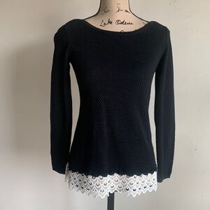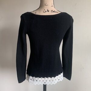 La Vie L’ Amour long sleeve lightweight sweater. Black body, white lace hem, scoop neck.