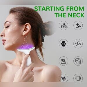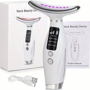 Advanced neck beauty device with LED display. Features multiple modes and USB charging. Sleek white design.