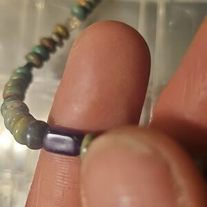 Elegant multicolor turquoise and sterling silver beaded necklace perfect for adding a pop of color to any outfit. Features a blend of green, brown, and purple beads for a unique look. CP clasp