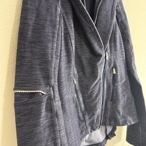 Stylish dark blue blazer with unique zipper accents. Perfect for any occasion.