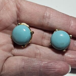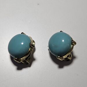 Vintage Gold Tone Round Blue Bead Clip On Earrings