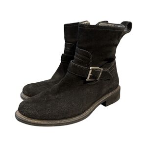 Classic engineer-style ankle boots by Cougar crafted in black suede with a rugged, moto-inspired silhouette. Features a functional side zip, adjustable metal buckle strap, and a low stacked heel for everyday wearability. Waterproof construction makes these a solid choice for fall, winter, and city wear without sacrificing edge.