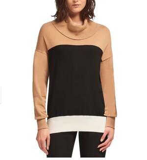 DKNY Colorblock Pullover Sweater in Beige, Black, and White, Women's Size XL. This stylish knit features a cozy cowl neck and a modern tri-color block design. Perfect for fall and winter layering.