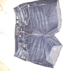 Stylish blue denim shorts. Features embellished back pockets. Perfect for casual wear.