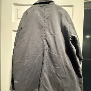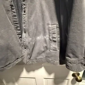 There are a cpl of drywall dust spots on sleeve and right side (shown in pics) and paint spots on collar as well (also show in pics). I think these would wash out and you would have a really good heavy carhartt jacket