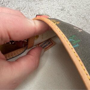 Black wristlet with colorful DB logo pattern throughout. Signature pink Dooney and Bourke heart on the side. Snap closure and wristlet style. Please note last photo flaw (and 4th photo). Some faded wear. Good condition with love left!