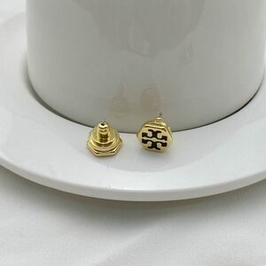 Chic hexagon earrings with iconic Tory Burch logo. Gold and black design adds elegance.