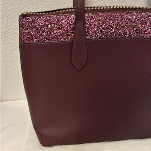 Kate Spade Flash Glitter tote. Color is called Cherrywood. I’d say it’s a maroon/ burgundy mixture with pink sparkles. Measures approx 14” long, 11” tall, and has a handle drop of approx 10”. Zipper closure. The inside has one pocket. The handles will need to be gently folded down to ship this bag. This was purchased brand new and never used.