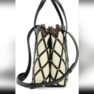 A lattice-inspired overlay punctuated with gleaming iconic pyramid studs pops against the ivory leather of this compact bag furnished with a removable shoulder strap. Open top carry handles, removable and adjustable shoulder strap. Structured silhouette with flat base for stability.