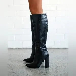 Billini boots, croc embossed boots, knee high boots, black statement boots, block heel boots, pointed toe boots, trendy fall boots, chic boots, going out boots