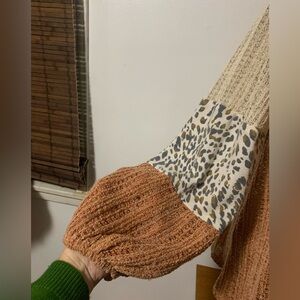 Boho Patchwork Mixed Print Babydoll Top, Crochet Trim Leopard Print Blouse, Color Block Textured Peasant Top. Elevate your boho chic look with this unique patchwork blouse that features an eye-catching mix of leopard animal print, solid burnt orange/rust panels, and delicate cream-colored crochet or thermal knit textures. Loose sweater weave that is sheer as seen in photos. Size/fabric tag is faded, based on measurements I’d estimate it to be a L but make sure you check out the flat measurements in the photos to make sure of fit.
