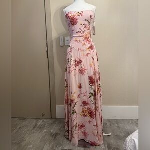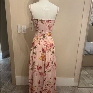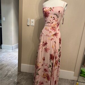 The Bea Dress from Reformation, a sleeveless full length dress with a straight neckline, drop waist, and high side slit.